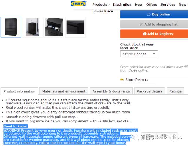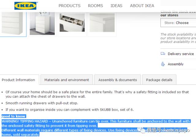 ▲新加坡宜家官網首頁最下方才可以看到與馬爾姆抽屜櫃相關的安全提示