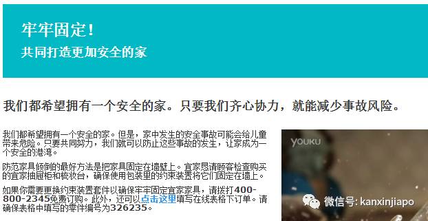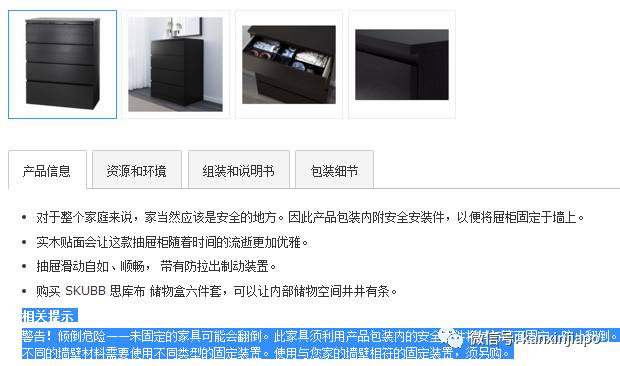 中國宜家官網提示消費者可以免費訂購牆上固定零件,除此以外對抽屜櫃只是提出安全提示,沒有任何深入的解決方案!