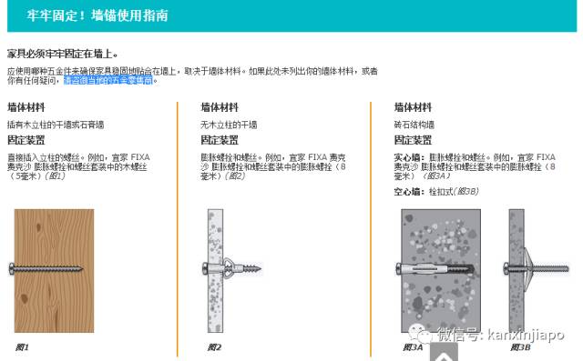 針對不同牆體,宜家給出選擇固定零件的建議: