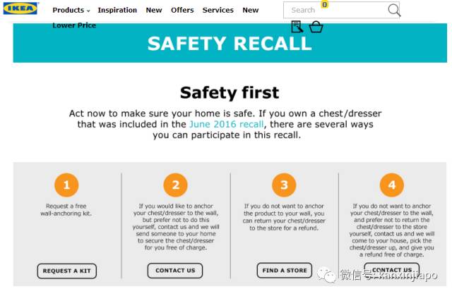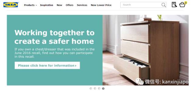 ▲美國宜家官網首頁,醒目位置提醒客戶處理馬爾姆抽屜櫃安全隱患