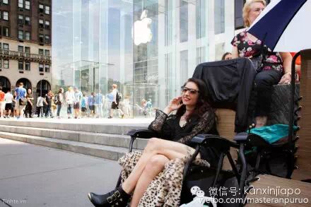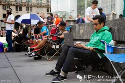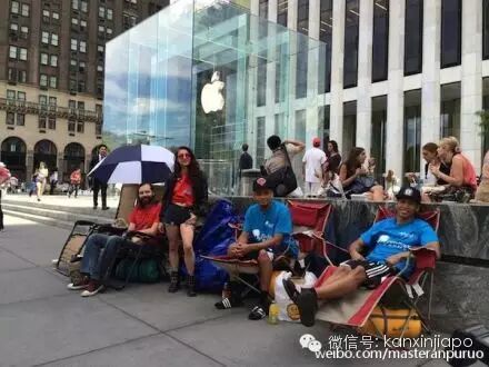 兩款iPhone 6手機將于9月19號在美國等9個國家地區首發,很多人5天前就已開始在蘋果零售店外排隊等待。據一身在美國的華商微博粉絲爆料,17日晚他們所在的城市就已經有人開始排隊了,一個華人面孔的黃牛非常厲害,25把椅子一個人看著。話說第一個粉色馬紮好亮!