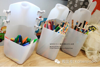 最後分享一個牛奶桶做筆筒的方法,如圖所示,就算孩子們把筆都倒出來了,我也能幾下就收拾好。