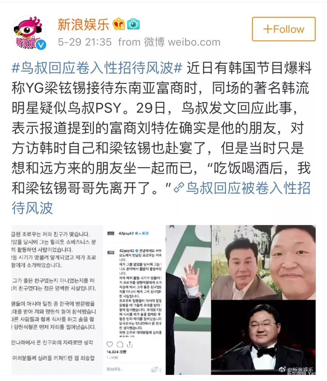 李勝利的前經紀公司YG老板梁铉錫又被韓國節目《探查企劃Straight》爆出涉嫌性招待,YG娛樂2014年曾招待泰國富豪Chavanos Rattakul及馬來西亞金融大亨劉特佐,連唱《江南style》大火的鳥叔(PSY)都身陷其中!