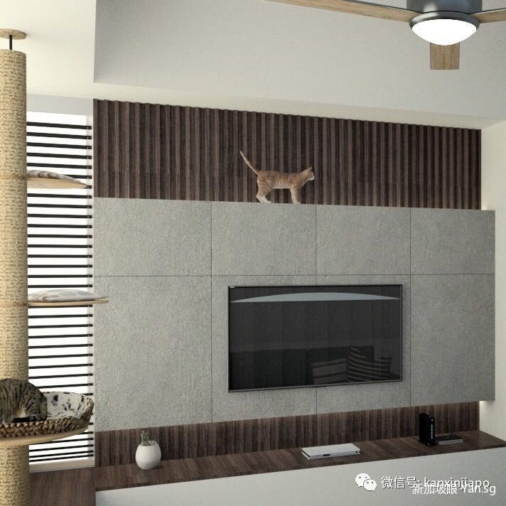 電視牆也能設計變成家中喵星人的遊樂園。這樣的空間利用,讓貓更加舒適,主人看電視也多了很多生趣!