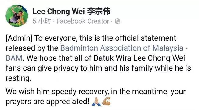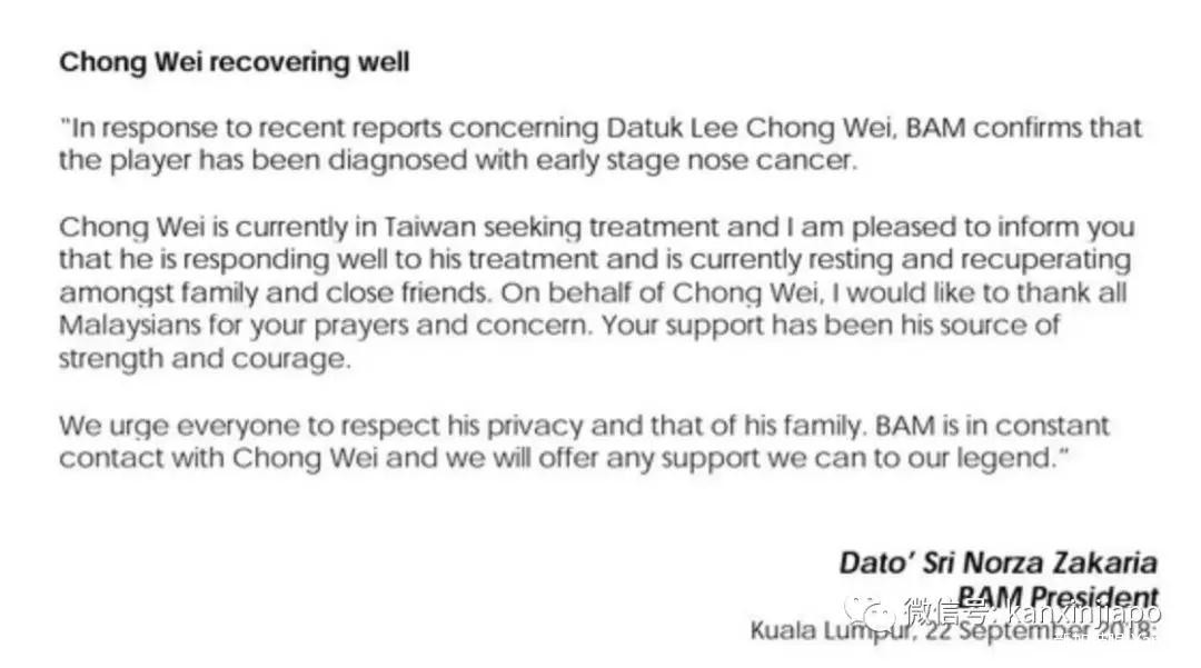 馬來西亞羽球總會會長諾紮也發表聲明說:“李宗偉目前在台灣就醫效果良好,正在親友的陪伴下休息和恢複。”