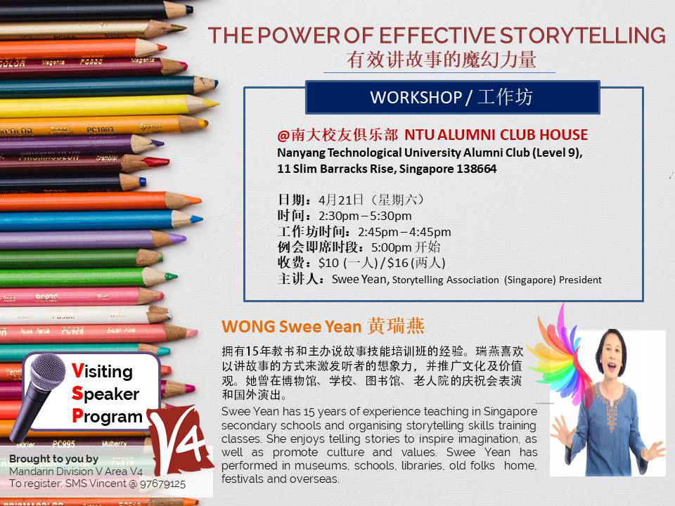 那麽問題來了,我們怎麽樣才能有效的提升自己的口才,和演講技巧呢?和衆多其他的技能一樣,演講,同樣需要刻苦的練習,這裏我們不得不提一個組織,TOASTMASTERS,這是一個國際性的演講組織,20世紀初成立于美國,至今已有近百年曆史,在新加坡已經有200多家分會,遍布全島的高等學府,跨國企業,專業型組織,以及全島的各個民衆聯絡所之中,爲廣大民衆提供一個暢所欲言的演講平台。更多關于TOASTMASTERS的詳情,可以在谷歌或者百度搜索相關信息,在此TOASTMASTERS新加坡區域V4分區的所有分會,歡迎所有渴望成爲職場超級演說家的朋友,莅臨我們的每月例會進行觀摩與學習,說不定,你就能找到那邊升職加薪,走向人生巅峰的鑰匙!