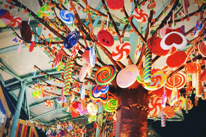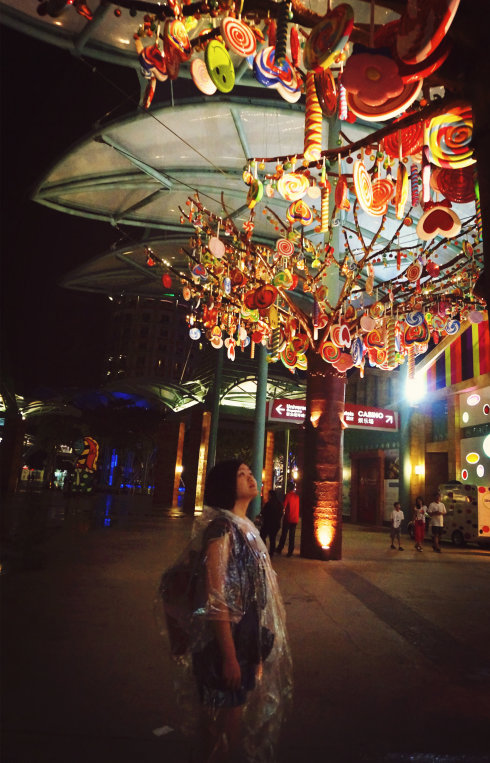 ↓晚上7點多的時候下起了暴雨,本想看八點整的煙火表演也沒戲了。好在環球影城該玩的基本都完成了,出來後去門口的糖果世界逛逛。