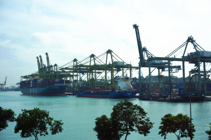 ↓路上可以看到新加坡港集裝箱碼頭,哈哈哈哈,原來我們公司那麽多的挂面都運到了這裏啊。幹一行愛一行,看到這些箱子,好親切。