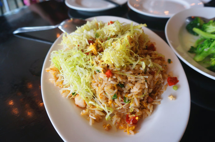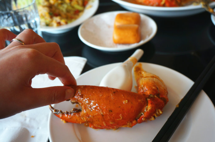 ↓下午兩點半了才吃中飯。在VIVO CITY找到了傳說中的無招牌海鮮坊。根據推薦點了斯裏蘭卡蟹,一只3斤左右,辣味的。是把蟹黃取出與雞蛋,辣醬勾芡澆在蟹殼上,黃金小饅頭蘸湯汁吃是一大特色。據說黑胡椒口味的也很火,但是幹的,沒法蘸小饅頭吃。後來在馬來吃了一次,各有各的特色。又很不合時宜的點了中國菜,揚州炒飯,蒜蓉西蘭花。