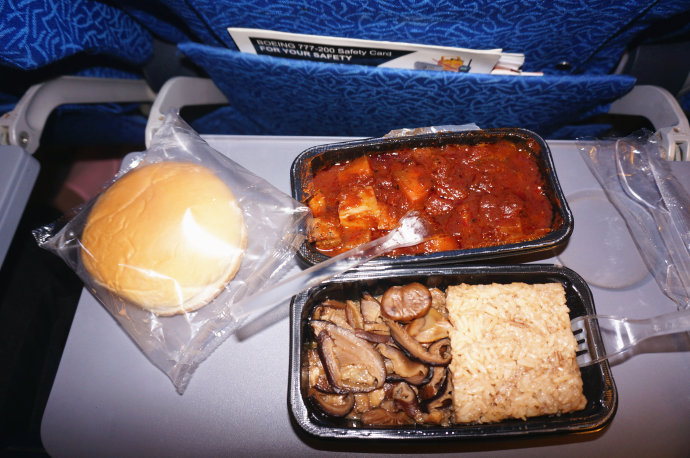 ↓機上兩份飯,24新幣,消費真心高啊。好在味道不錯,新航餐飲是出了名的好,所以酷航也差不到哪去,甩了亞航N條街。