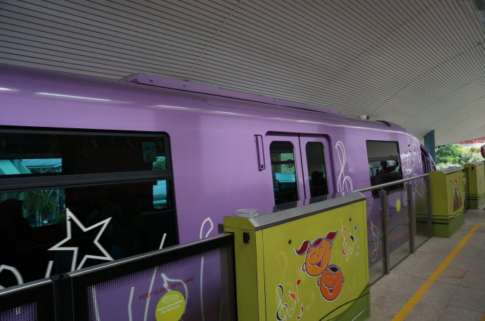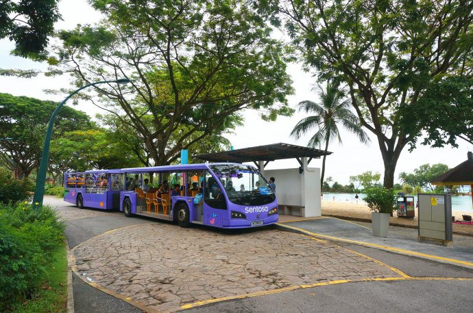 ↓島上有這種免費的捷運車可搭乘,時間充裕的話最好選擇步行,因爲聖淘沙真的很好逛。下面是站牌和捷運車的樣子。