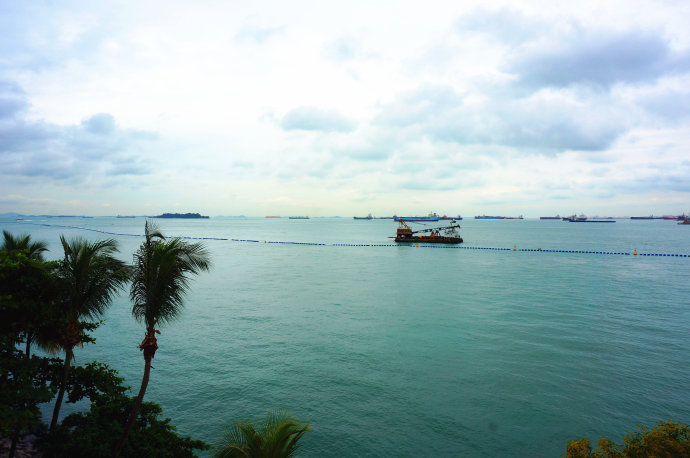 ↓轉過身來向南邊望去,海的那一邊應該就是印尼了。海裏有這麽一條看不到兩端盡頭的漂浮物標記線,想知道這是國際線劃分新加坡和印尼的嗎?要不然是啥嘞?求科普。