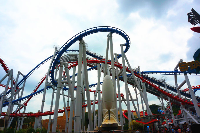 ↓世界上最高的雙軌過山車。藍色軌道最爲刺激,背挂式,可惜沒拍到。