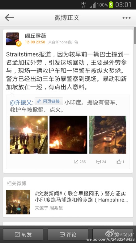 網友折翼小仙女Scarlett: 新加坡小印度由于一起交通事故引發暴亂,警車被燒毀,警員殉職,幾百人參與暴動。在我看來任何事情都是有原因的,哪怕是號稱世界上最安全的國家,新加坡長期對于外勞的不公正和歧視也許是這場事故的導火索