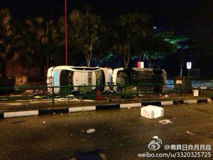 “聽說小印度有暴亂…那地方離我這邊只有5分鍾車程,看熱鬧不嫌事大的我趕緊驅車奔赴現場圍觀…到路口就進不去了,全是警車、消防車和救護車,遠處的事發現場火已熄滅,還能看到縷縷濃煙和車輛的殘骸…”(@oo叫獸xx 2013-12-09 00:13發布)