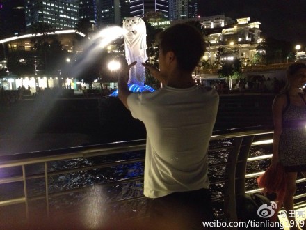 在新加坡的標志性景點魚尾獅旁邊,他又發微博給森蝶:“女兒啊,爸爸想你可又回不去家,想來想去,給你抓條魚吧。這次爸爸沒下水,站岸上就抓zao了,這魚長個大獅子頭,超級可愛還會噴水