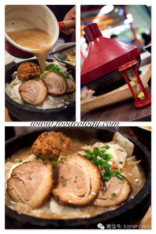 端上桌的是一個300度的石鍋,裏面放好了拉面、叉燒、蔬菜、雞蛋等材料。然後倒入高湯,蓋上大紅“煙囪蓋”。當看到“火山口”有蒸氣冒出時(這時的蒸氣是真的燙得像在火山口),用桌上的漏鬥計時一分鍾,就可以開蓋來吃了。