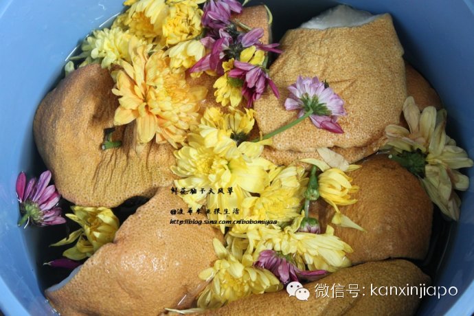 滿月時的大風草柚子皮鮮花水,柚子皮是提前曬幹的,再用熱水煮,鮮花放在上面點綴。