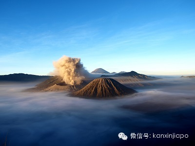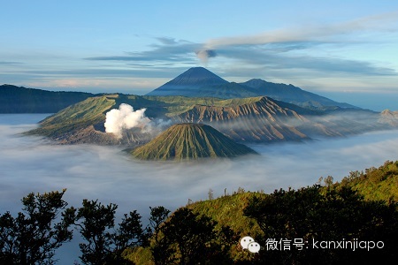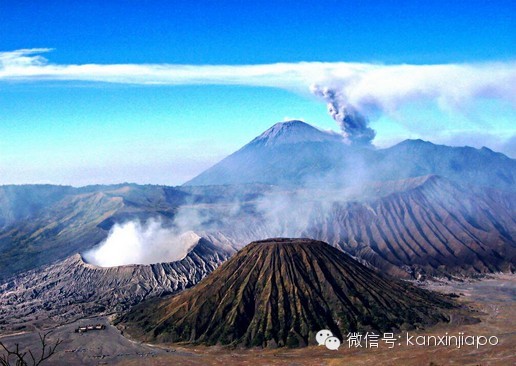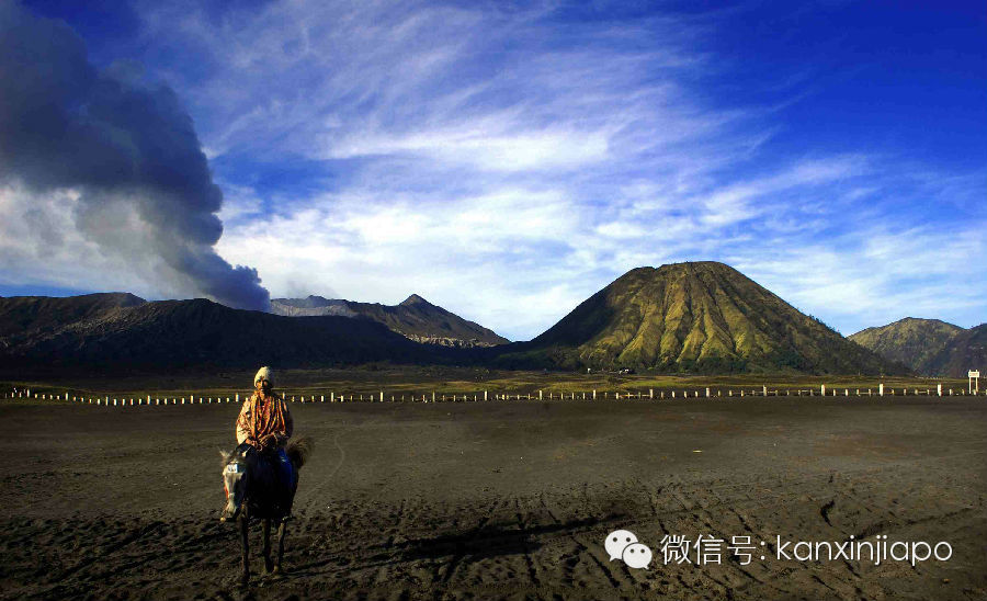 三十多年前,泗水有個半夜騎馬上山看日出的節目,就是爲了觀賞世界三大最美麗火山之一的布羅摩火山。登山看日出,不恰太陽還在雲堆裏掙紮,火山群卻已全體亮相,布羅摩的山巅總是挂著一頂小雲帽,那是它早起後在過煙瘾?