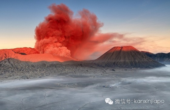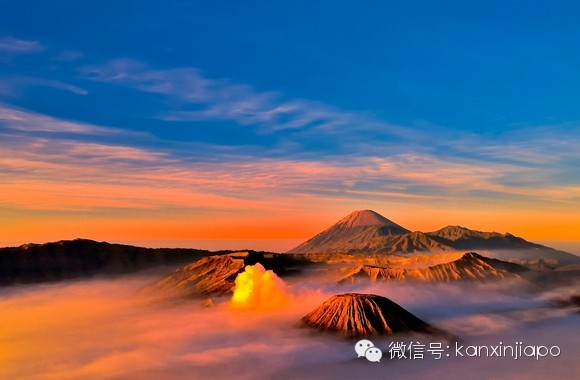太陽還在雲堆裏掙紮,火山群卻已全體亮相,布羅摩的山巅總是挂著一頂小雲帽,那是它早起後在過煙瘾?