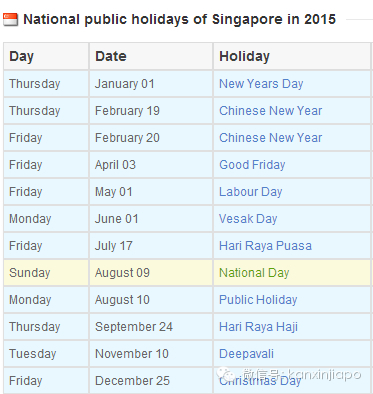 8月9日(周日)國慶節:無需請年假,盡享3天周末小長假。2015年的國慶日(8月9日)是周日。按照慣例,隔天星期一也將會是個公共假日。