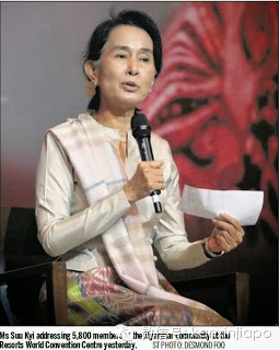(2013年9月22日初訪新加坡的翁山淑枝,在聖淘沙Resort World對5800名緬甸僑民發表演說。Straits Times,September 23, 2013)