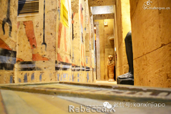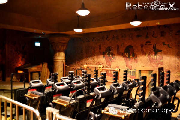 木乃伊的邊上就是寄存處,一定要將相機背包全部寄存哦,不然玩起來不過瘾的。如果只想進去拍照(我就是這麽做的),選擇晚上7點半以後,這時候由于裏面的音樂很恐怖,人少空調冷,氣氛很像鬼屋,可以在排隊的地方一路拍照,排隊長廊裏不少神殿裝飾和棺木,等到了坐過山車的地方,直接找快速出口,就可以離開了。