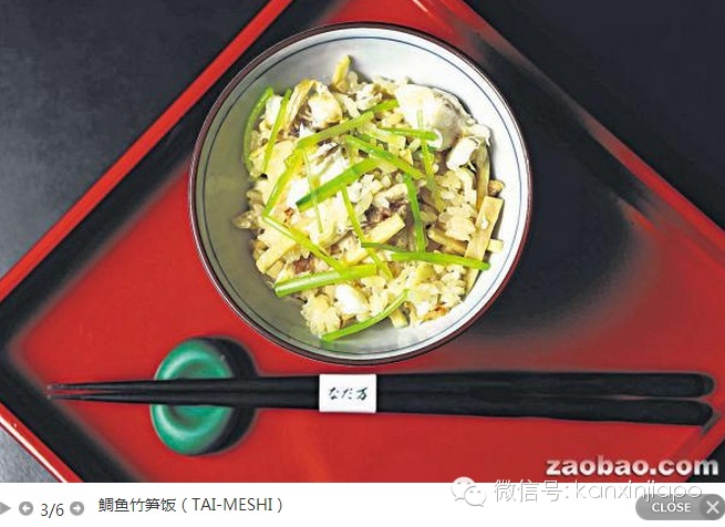 七、飯煮熟後,鲷魚去骨混入飯中。盛入碗裏後,再綴以日本香菜。