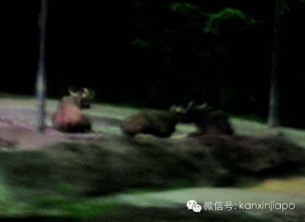 除了拍照,40分鍾的遊覽車緩緩駛過8個展區:喜馬拉雅山麓,尼泊爾河谷,印度次大陸,非洲赤道地帶,印尼 – 馬來亞森林,亞洲河區森林,南美雨林和緬甸山腰,聽著解說觀賞各個展區各種珍稀動物的夜間性態還是很有收獲的。看著這些同爲地球精靈的動物,或覓食,或散步,或休閑,有些動物近到幾乎可摸,不得不贊賞動物園管理的傑出,同時也深切地感歎野生動物的生存空間已被人類壓縮地太小!