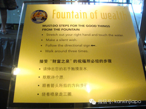 請注意裏面那圈小噴泉,每隔一段時間,外面的大噴泉會停止噴水,可以讓人進到裏面去摸那小噴泉。據稱圍著它順時針轉三圈,可保佑財運亨通,連新加坡的財長都會去求個彩頭。