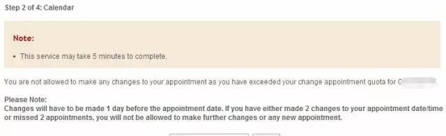 移民廳提醒:申請者如果更改預約2次,或者錯過預約2次。將不能再做任何更改,或任何新的預約。所以,上面這個勤快的事主,連續取消了來年1月、當年11月的預約後,8月的位就算有,他也訂不上,眼看快煮熟的鴨子,飛了!