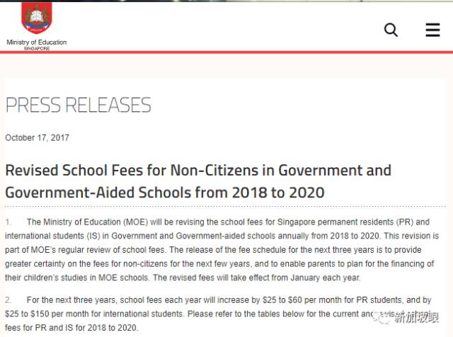 新加坡教育部(MOE)今日發布公文表示:將對在新加坡政府和政府資助學校讀書的PR和國際學生未來三年(2018-2020)漲價,每月學費將上調新幣25元至60元, 非永久居民的外籍學生每月學費上調新幣25元至150元不等。