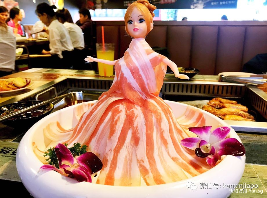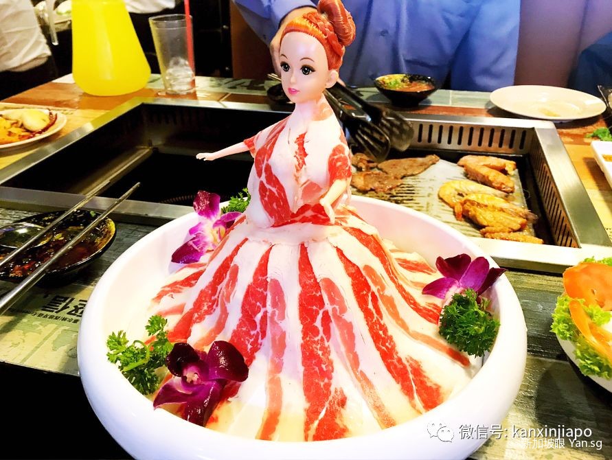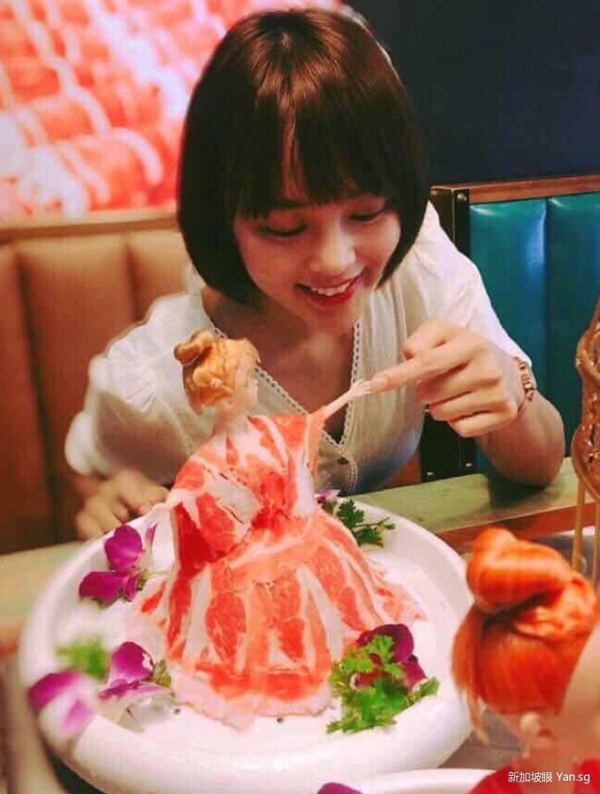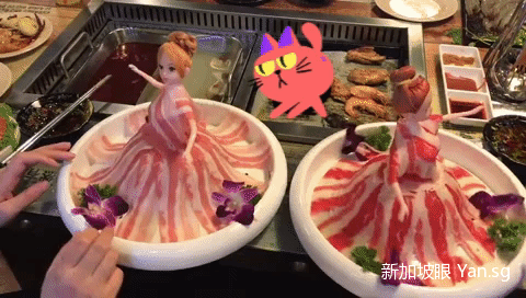 先來看看人氣芭比。她身上穿的是正宗澳洲肥牛小禮裙~肥瘦相間的薄肉片,做成了美麗的紅白相間火鍋禮服。