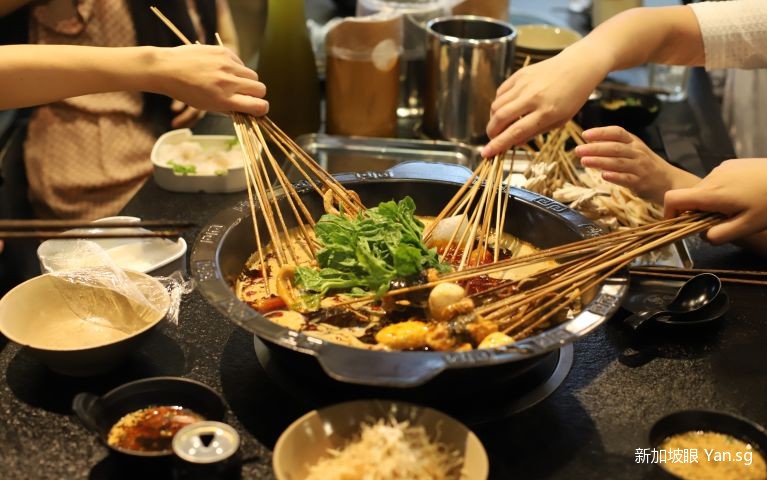 有麻辣鍋底、藥膳烏雞鍋、酸蘿蔔老鴨鍋、香濃番茄鍋和野山菌湯鍋。菜品算是新加坡最全的,有上百種的串串。