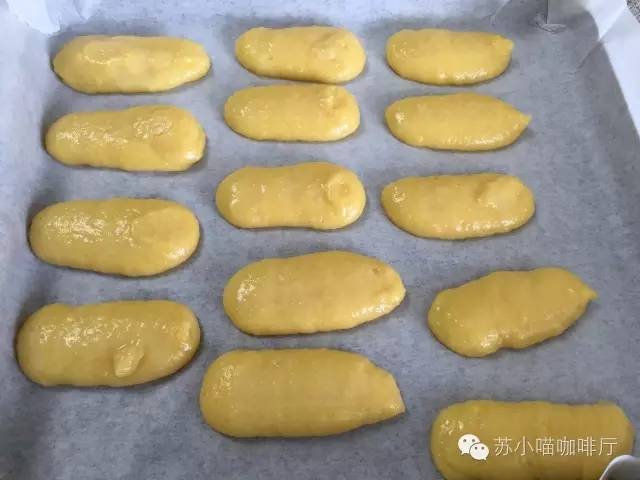 然後在鋪了烘焙紙的烤盤上擠出閃電泡芙的形狀。因爲泡芙會膨脹的很大很大,所以間隙要盡量留大一點。最好比照片上再更大一些。然後在泡芙的表面薄薄地刷上一層清水就可以送進烤箱啦!中層,上下火,210度烤大概10分鍾,然後把烤箱溫度調低至170度,再繼續烤20分鍾左右。因爲泡芙大小的不同,最後的幾分鍾請大家務必守在烤箱旁邊,依據泡芙表面的顔色來判斷。烤到表面金黃就可以了。