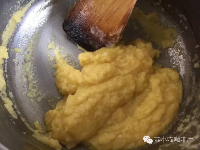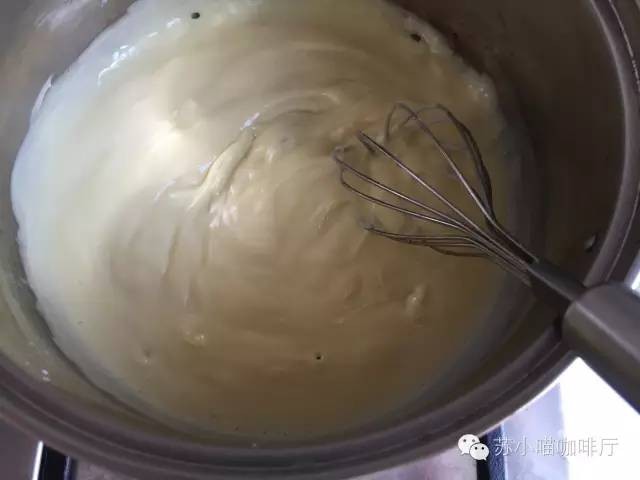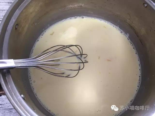 然後用中火煮,邊煮邊攪。大概七八分鍾以後蛋奶糊就會變得濃稠了。