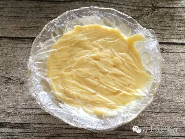 攪到這個樣子就可以倒進碗裏晾涼了,記得貼著蛋奶糊的表面蓋一層保鮮膜,不然蛋奶糊的上面會形成一層比較幹的皮。