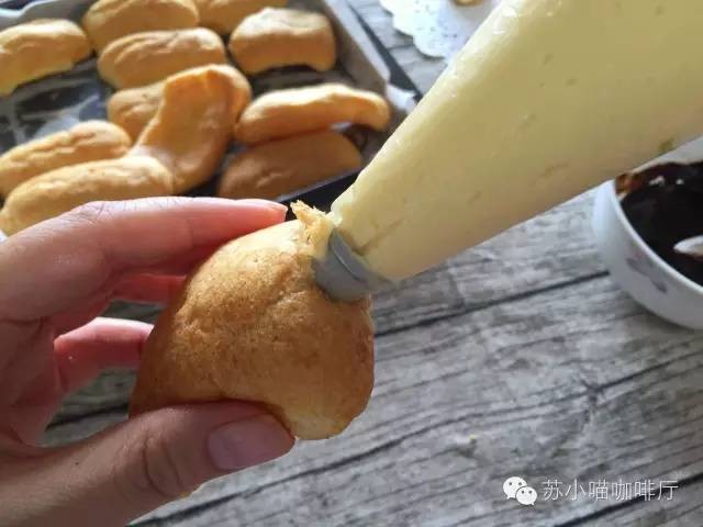 然後把蛋奶餡裝進裱花嘴,從一端擠進一些蛋奶餡,再從另一端擠進一些蛋奶餡就可以啦!擠的時候可以感覺到泡芙漸漸變得飽滿了呢。