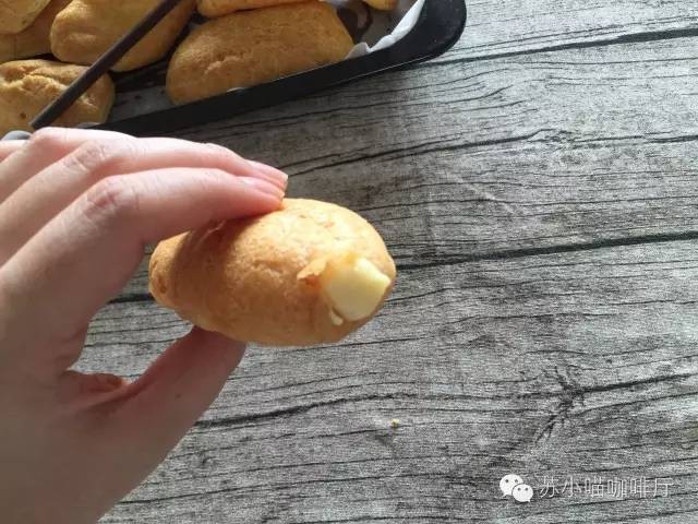 烤好的泡芙就是這樣的~掰開以後用手拿拿看,真的很輕很酥哦!!然後我們用竹簽在每個泡芙的兩端紮一個小孔,靜置放涼。