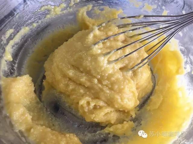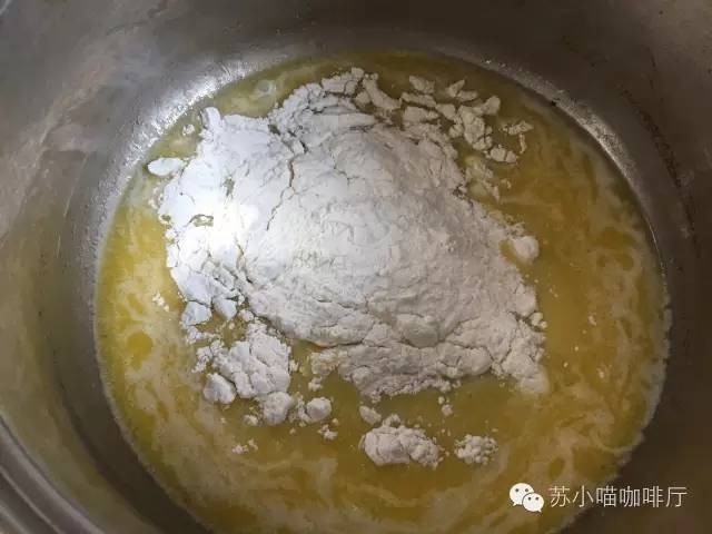 然後關火加入面粉,用打蛋器手動攪勻。一開始看起來確實是亂糟糟的一大團,但是只要繼續攪下去就會變成比較均勻的面糊哦。