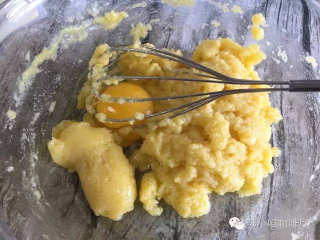 面糊倒出來以後我們用打蛋器繼續手動快速攪拌面糊,讓它變得更細膩並且幫助面糊降溫。等面糊已經沒有那麽熱的時候,打入一個雞蛋。攪勻後再加入另一個雞蛋攪勻。哦對了,這一步請預熱烤箱到210度。