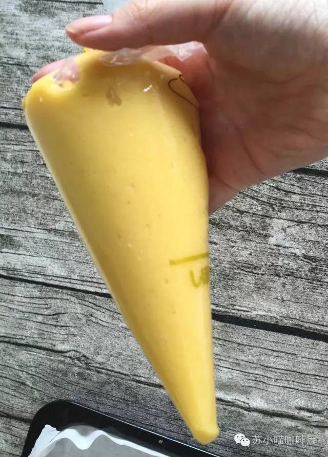 然後我們就可以把面糊裝進裱花袋啦,沒有裱花袋的同學們也可以用密封袋剪一個小口哦!