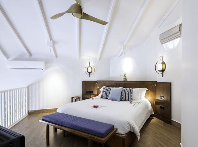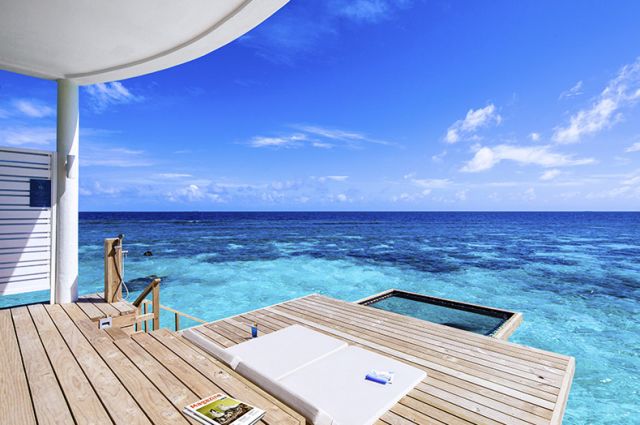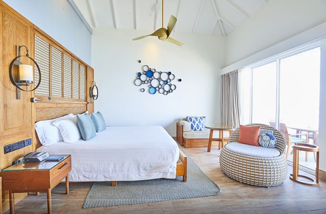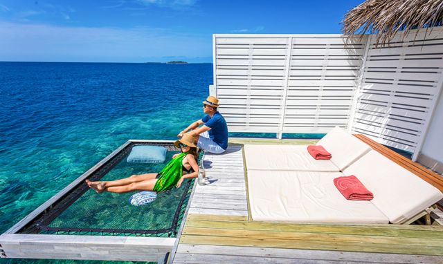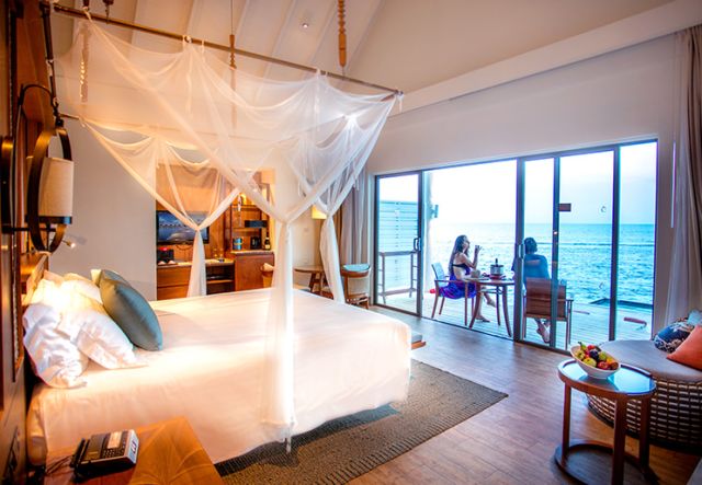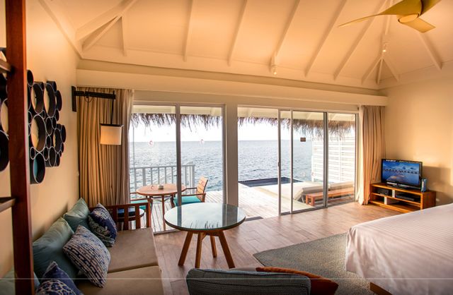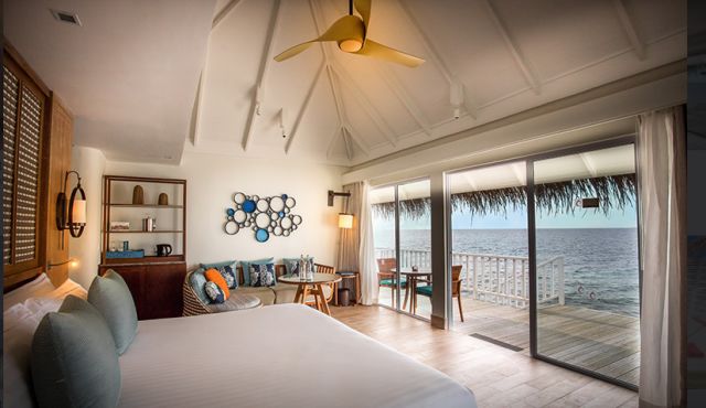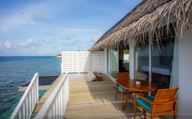 豪華水上別墅Deluxe Water Villa豪華水上別墅設置在島的北側,擁有寬敞的空間,可以選擇一個特大號床或兩張單人床,浴室內設有淋浴和海景的浴缸,打開大門便可看到無盡的天邊,你可以在溫暖的瀉湖裏享受遊泳和浮潛。