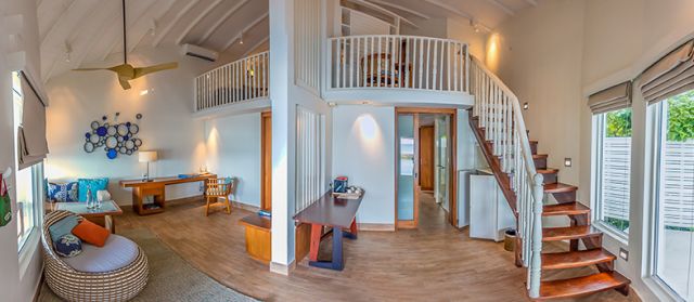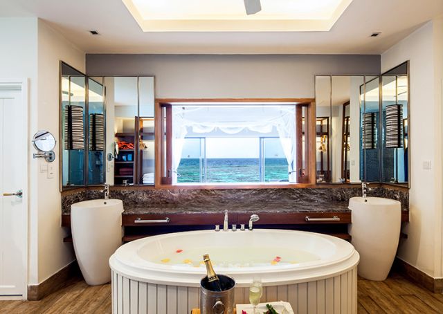 海洋水上別墅位于島的西端,別墅配備有一個室外露台、一個寬敞的臥室、和一個帶淋浴的浴室通風良好和獨立的浴缸。你可以欣賞到壯麗的日落美景,或讓我們的廚師安排一個私人晚宴。只需數步就可以直接進入到波光粼粼的瀉湖中。