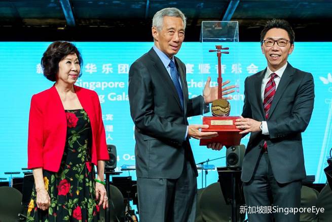新加坡華樂團董事主席吳紹均獻上一份特制三弦的紀念品給贊助人李顯龍總理。