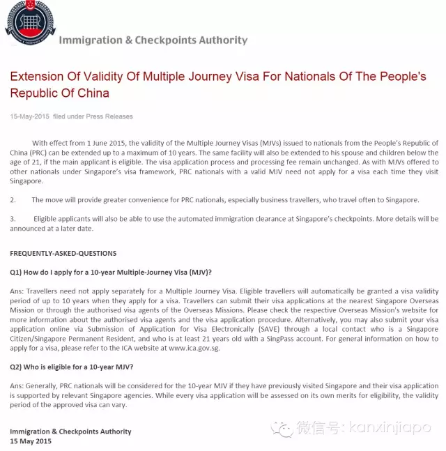 喜大普奔!新加坡移民關卡局今日宣布將爲中國公民開放新的簽證舉措,自2015年6月1日起,新加坡移民關卡局頒發給中國公民的新加坡多次有效簽證(MJV)將最長可達10年有效期,以方便中國旅客到訪新加坡。若主申請人獲得此項資格,其配偶、年齡未滿21歲的子女將獲得同樣的有效期限!