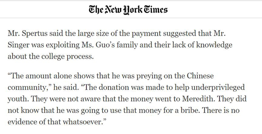《紐約時報》報道稱,很多中國家長並不知道美國申請流程,認爲這是一筆對學校的正常渠道的捐助,並不知道中間人會違法僞造材料進行申請。