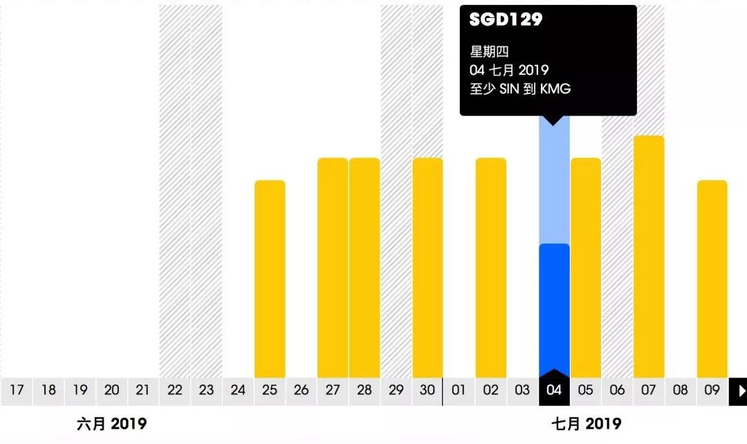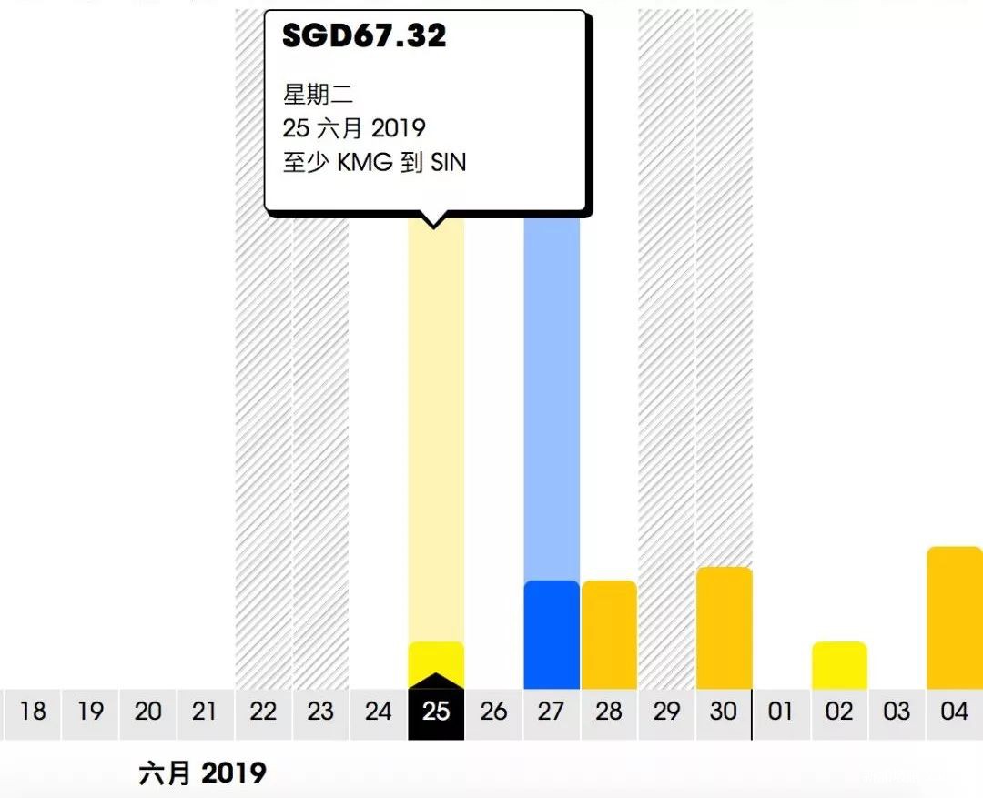 新加坡飛昆明的航班從6月25日開始,最便宜的機票在7月4日: