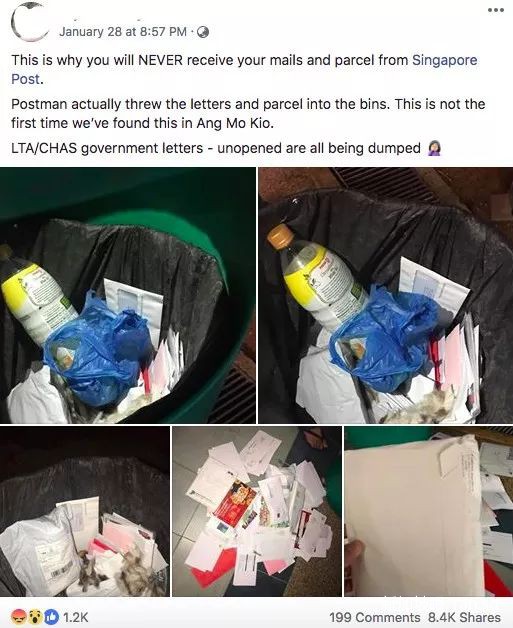前天(1月28日),有網友在 Facebook發文,痛斥新加坡郵政(以下簡稱SingPost)郵遞員不負責任,把未送達的信件丟在垃圾桶裏。