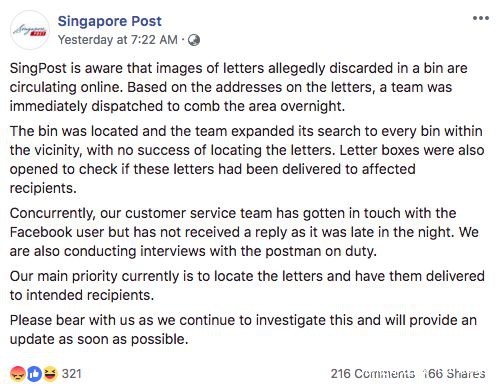 SingPost在次日早上7點發文,表示已經了解網友反映的情況,也已經根據信件上的地址,連夜排查了整個區域,但是還沒有找到這些信件。